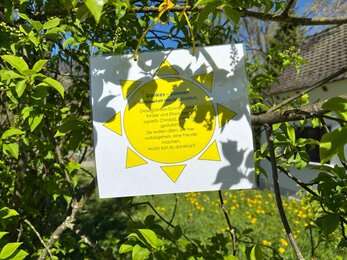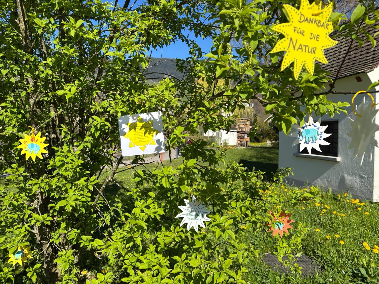 Die Kinder und Mamis/Papi durften miteinander «Dankes-Sonnen» beschriften und verzieren. Diese Dankes-Sonnen haben wir draussen auf dem Areal im Schärme an einen kleinen Baum befestigt. Dieser Beitrag soll alle, die daran vorbei gehen erfreuen und dazu ermuntern, sich bewusst zu sein, wofür sie dankbar sind.