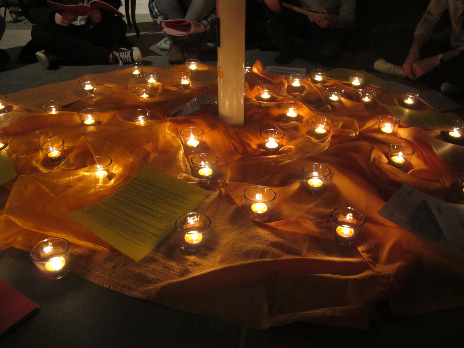 Auch äusserlich wird eine meditative Stimmung geschaffen mit orangenen Tüchern, Kerzen und einem Kreuz. Die Mitfeiernden sitzen nach Möglichkeit auf dem Boden (Kissen, Decken, Gebetsschemmel).